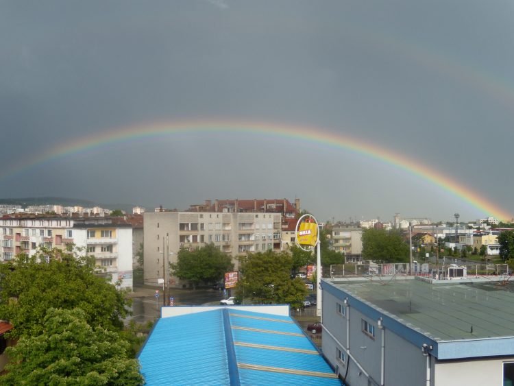 Today we had a great big rainbow, spanning the eastern sky of our city. I phoned friends to tell them to look outside and I took photos. I just stood there and looked at the beauty God gives us in the stormy times. There is no rainbow when the weather is all sunshiny and bright, but in the storm the sun peeks out and colors the sky. So, ladies, in your storm, may the Lord color your dark sky with His rainbow of promise. He’s not forgotten you!