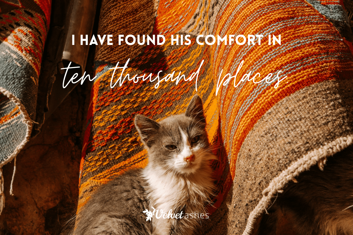 One of the neighborhood cats, a little gray thing who greets me each morning as I leave and each evening as I return, has refused to leave my side. As grief and shock turned to panic attacks, she lay on my chest and her gentle, rhythmic purrs helped me to calm down. Helped me breathe. In the persistent and unassuming presence of a street cat, I find the gentle comfort and closeness of the Lord.