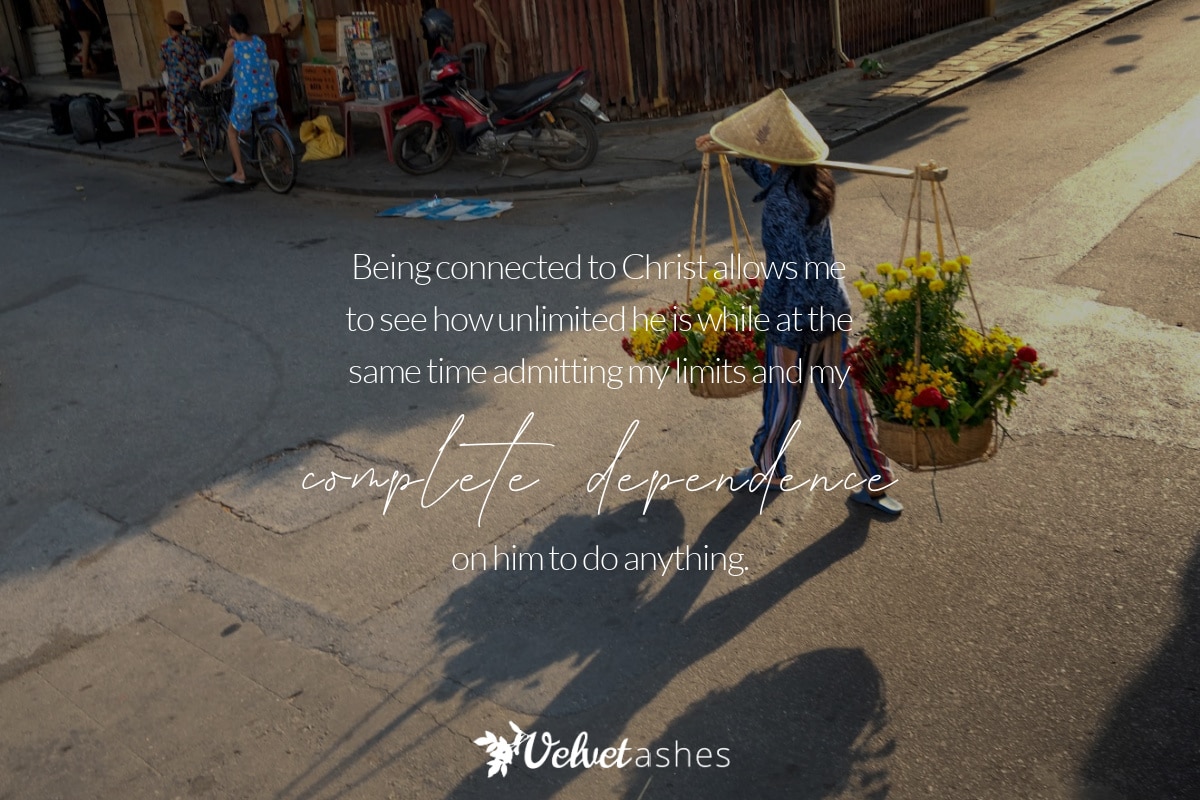 For 4 months, I couldn’t walk farther than 10 or 15 feet at a time as I recovered. I am a doer, I am the woman you want on your team to figure out how to get something done and do it, that’s my gifting. As I sat countless hours on my couch and laid in my bed, I lamented the state of my body and my capacity. I was angry that everything in our ministry had come to a complete halt because of my weakness. It was during that time that I had to concede that I have limits. I had to recognize that being connected to Christ does not make me limitless in mind, body or soul. Being connected to Christ allows me to see how unlimited he is while at the same time admitting my limits and my complete dependence on him to do anything.