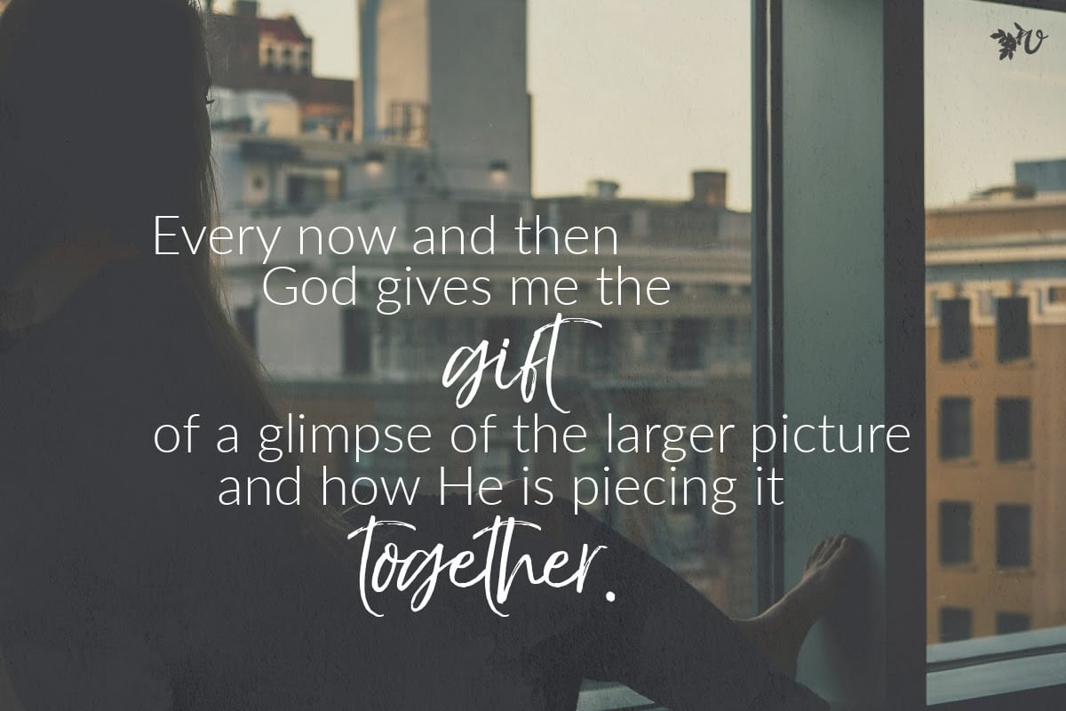 Often the whole picture is not for me to know. God knows the big picture, and he fits pieces together – one of which may be mine, and the other pieces are filled in by his work in other people.