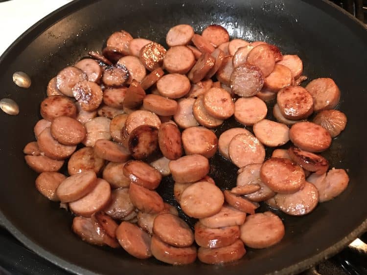 Add sliced or crumbled sausage to a pan and sauté until browned. Drain and set aside.
