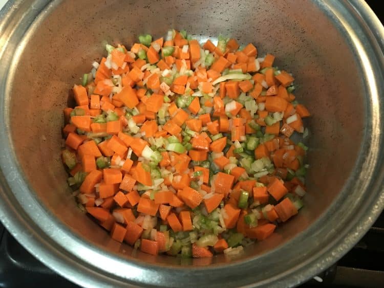 In a large pot, add olive oil. Once warm, add onions, celery, and carrots. Sauté until slightly softened. Add garlic, parsley, and 1 teaspoon of salt and cook until fragrant, 1-2 minutes.