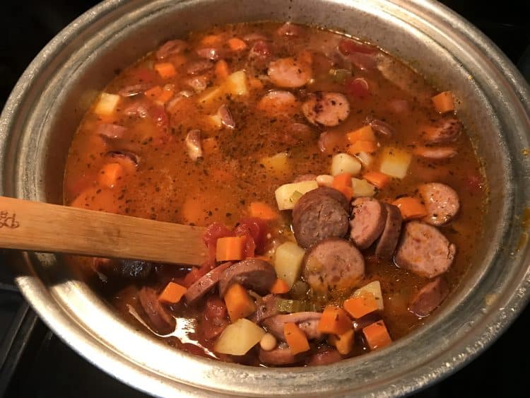 Add beans, tomatoes, potatoes, sausage, and broth to the pot. Bring to a boil. Reduce heat to simmer, cover, and continue simmering for 30–40 minutes, until vegetables are tender.