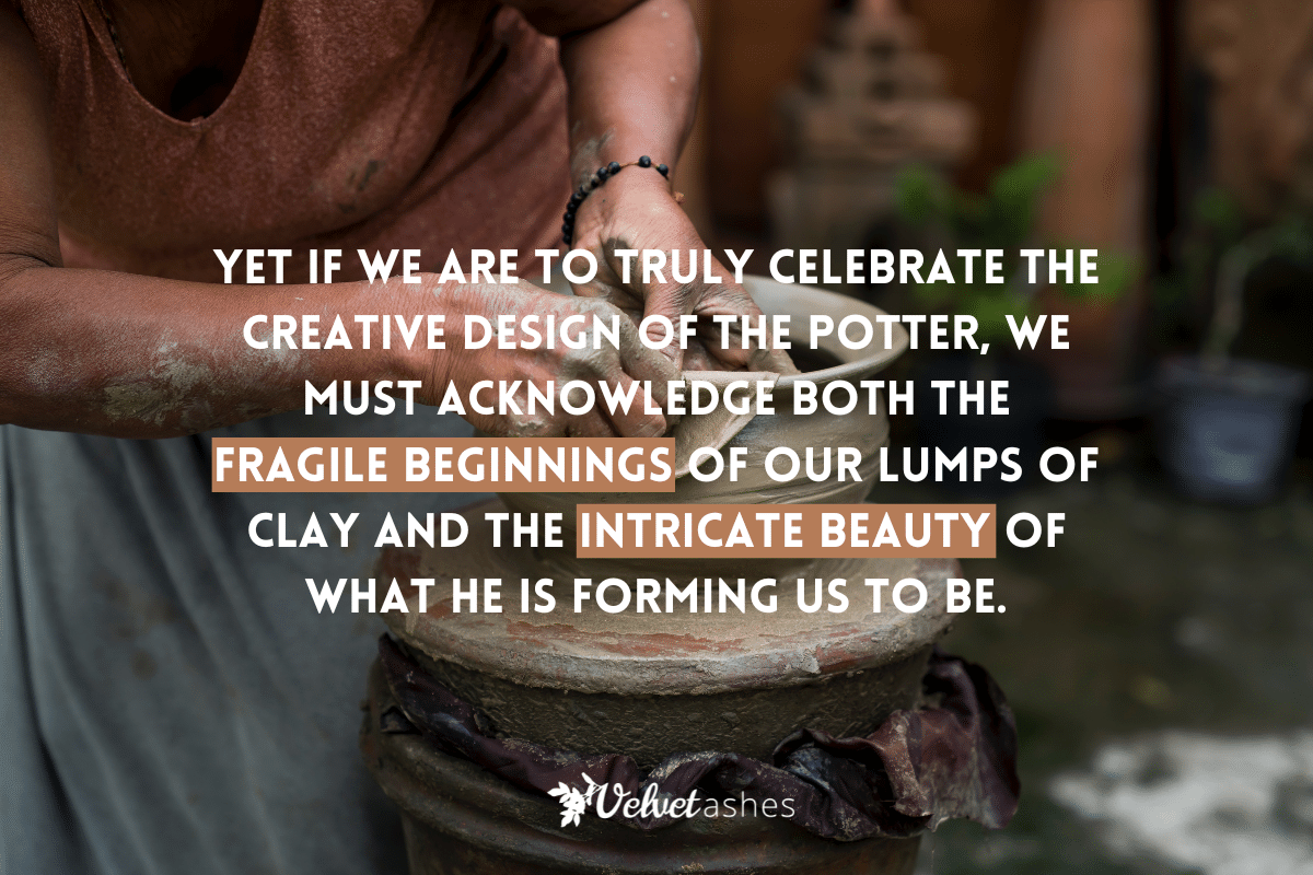 Yet if we are to truly celebrate the creative design of the Potter, we must acknowledge both the fragile beginnings of our lumps of clay and the intricate beauty of what he is forming us to be.