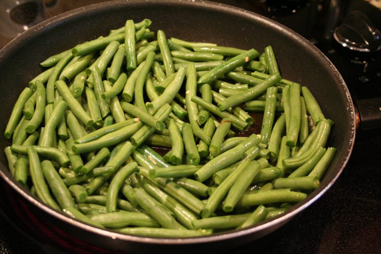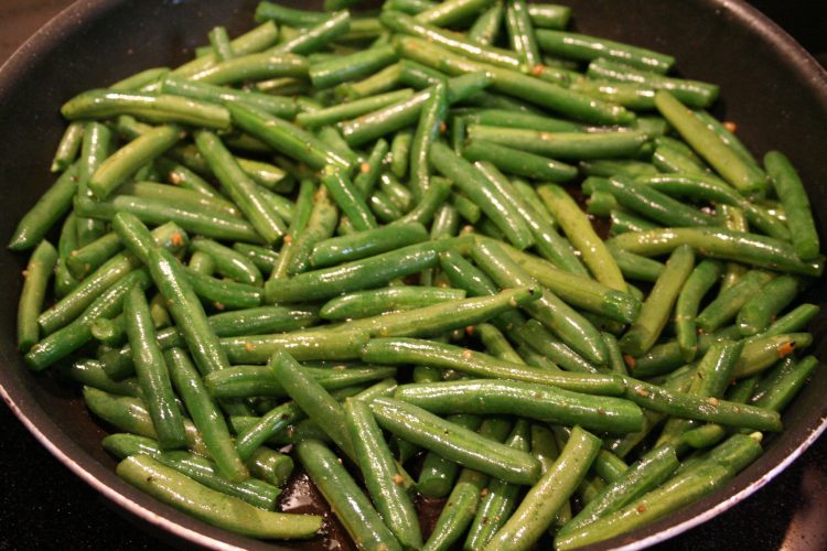 Rinse and snap the ends off the green beans. Snap into smaller pieces. Heat a few splashes of olive oil in a pan on medium high heat. Add garlic and cook until fragrant, 1-2 minutes. Add green beans, stirring and cooking until they turn bright green. Add 1/4-1/2 cup of water (I eyeball it! It’s forgiving, don’t worry.)  and cover with a lid. Cook, stirring occasionally, until beans are cooked through, about 10 minutes. I test this with a fork or taking a small bite, making sure they’re not squeaky.