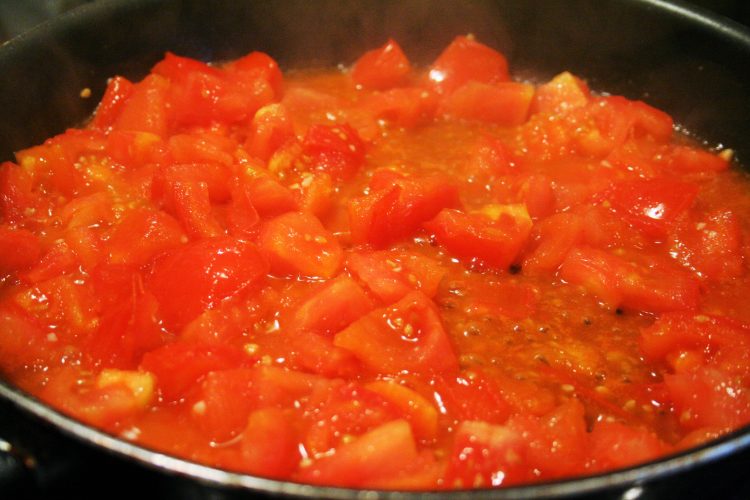 I forgot to take a pic of cooking the eggs, so just imagine it! Basically like scrambling them. Next, we’re cooking the tomatoes until their juices release.
