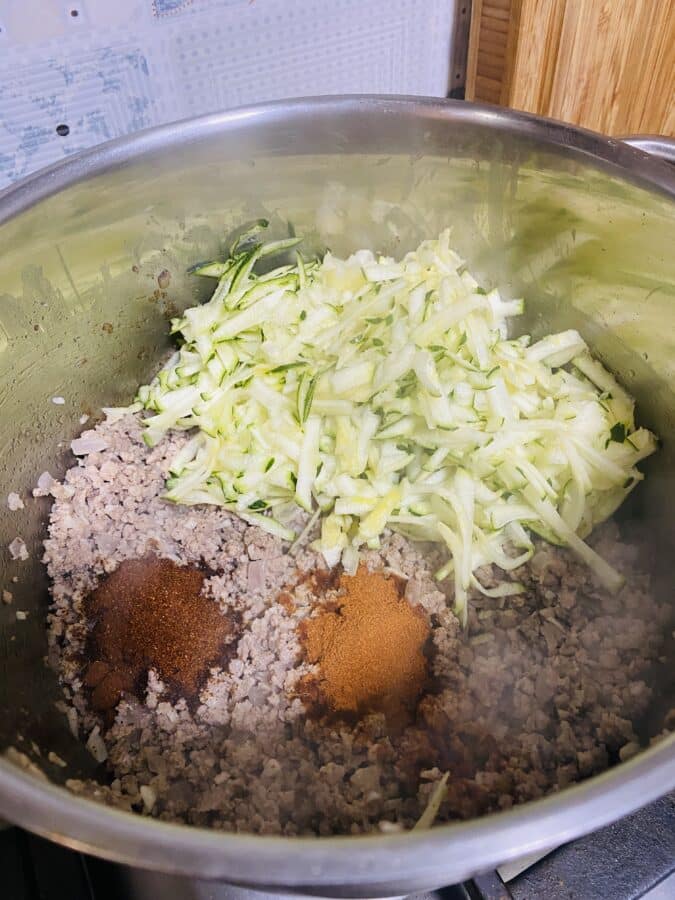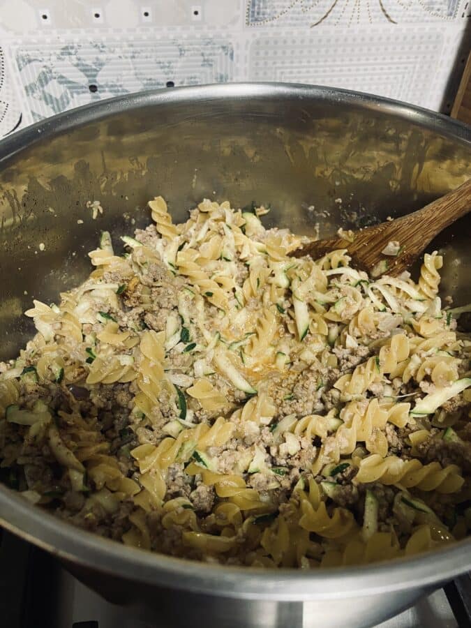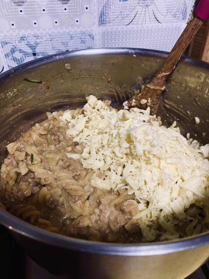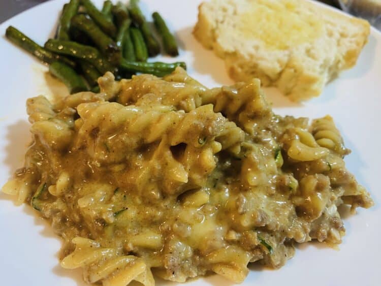 Hamburger Helper was a popular American boxed-pasta dinner choice in the ’90s. Cook the pasta, brown some ground beef, toss it with the provided seasonings, and you’ve got a meal! I’ve eaten it once or twice and it was . . . not great. But the concept of pasta mingling with ground beef and cheese is great! This recipe takes the comfort food of my childhood years and makes it delicious! My kids get second and third helpings each time I make it. None have noticed I sneak in zucchini for an extra veggie. Try it out and let me know what you think!
